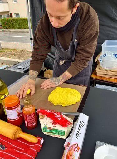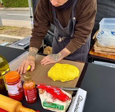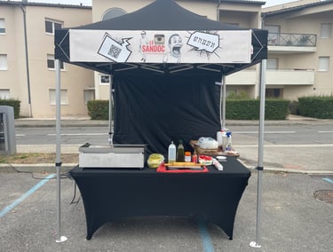 Petit à petit, chaque détail trouve sa place : le rideau derrière le stand, le système de montage plus rapide, et bientôt une carte bien visible pour présenter le menu. Le SANDOC s’ajuste, se façonne, s’améliore. C’est le début du vrai rythme, celui qui s’installe avec l’expérience et la passion.