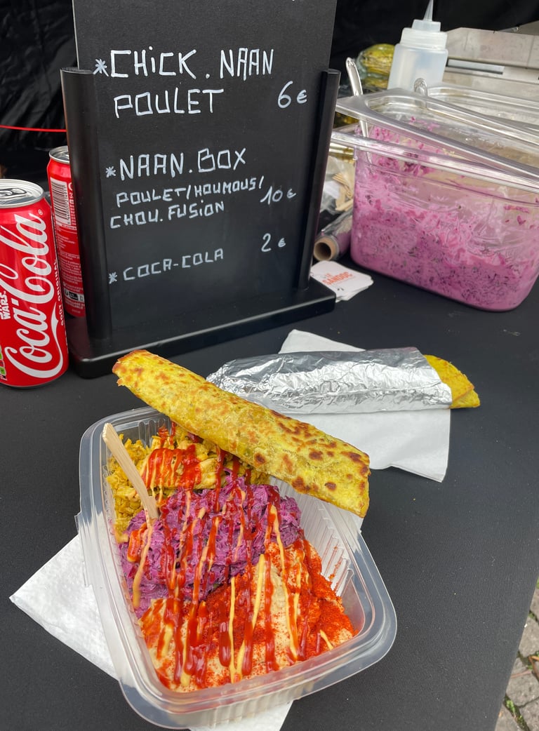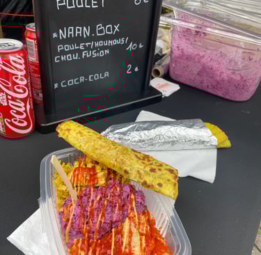 Un visuel concret. Un vrai naan fourré. Une portion de poulet mélanger avec le chou + le gourous et hop on fait un package, on sauce et on pose de la couleur. Pas une photo : un produit réel, visible, appétissant, qui raconte tout seul ce que je propose. Ce petit geste a tout changé dans l’ambiance de mon stand.